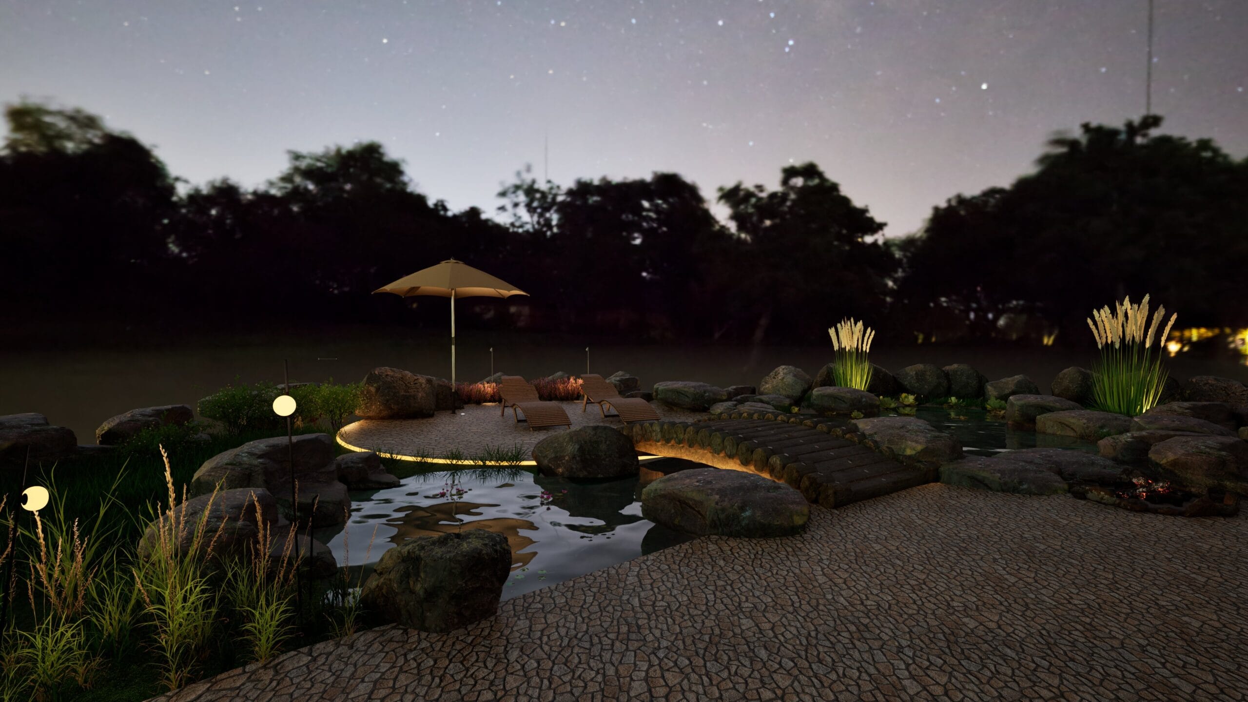 Auch Terrassen, Wege und Gärten können gezielt inszeniert werden und machen Architektur auch nach Sonnenuntergang erlebbar.